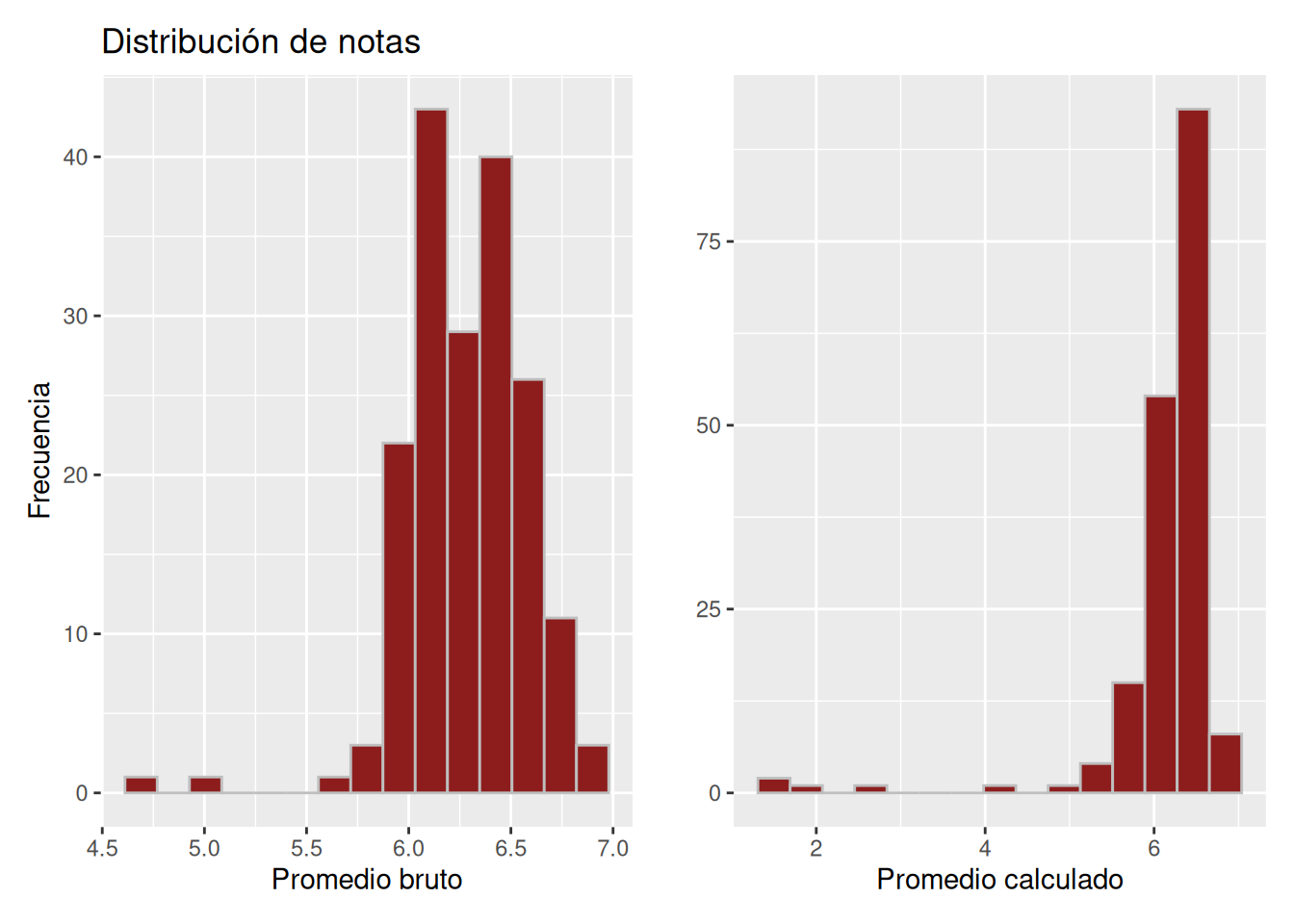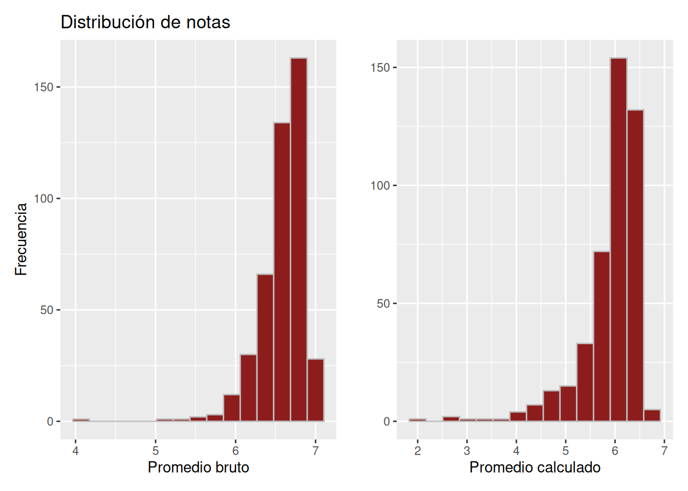 En Figura 4.5, los histogramas difieren de manera más marcada. En el promedio bruto, las calificaciones mínimas se sitúan alrededor de 5.0 y la mayor concentración se ubica entre 5.5 y 7.0. Por el contrario, el promedio calculado incluye valores inferiores a 2.0 y presenta una concentración destacada en torno a 6.5.