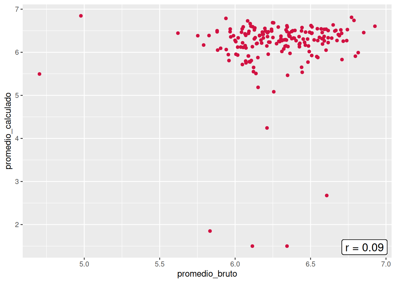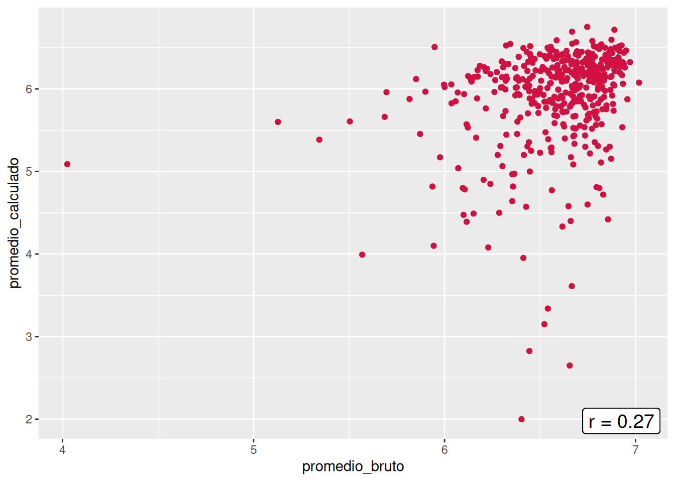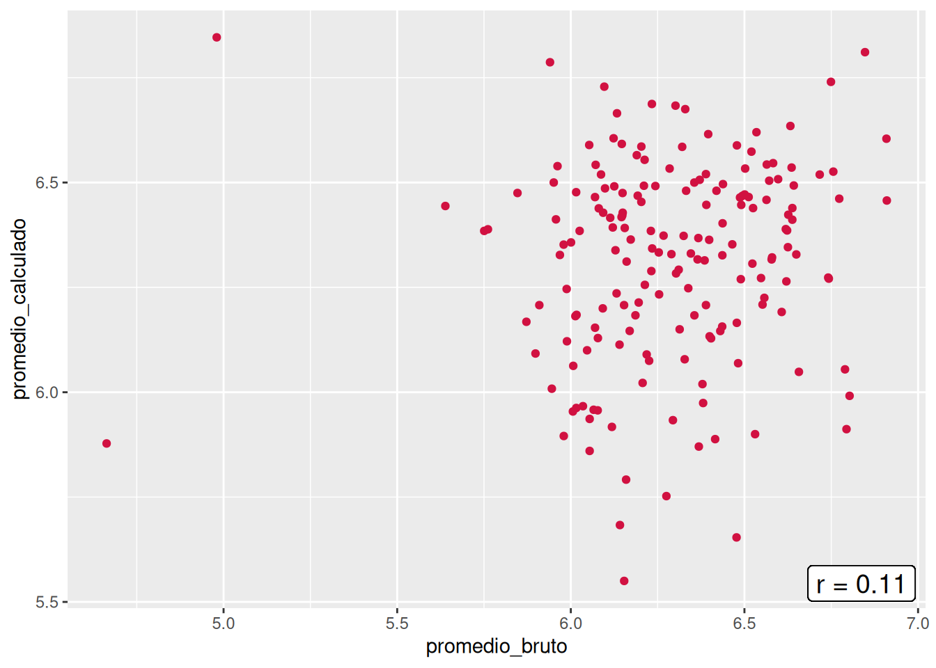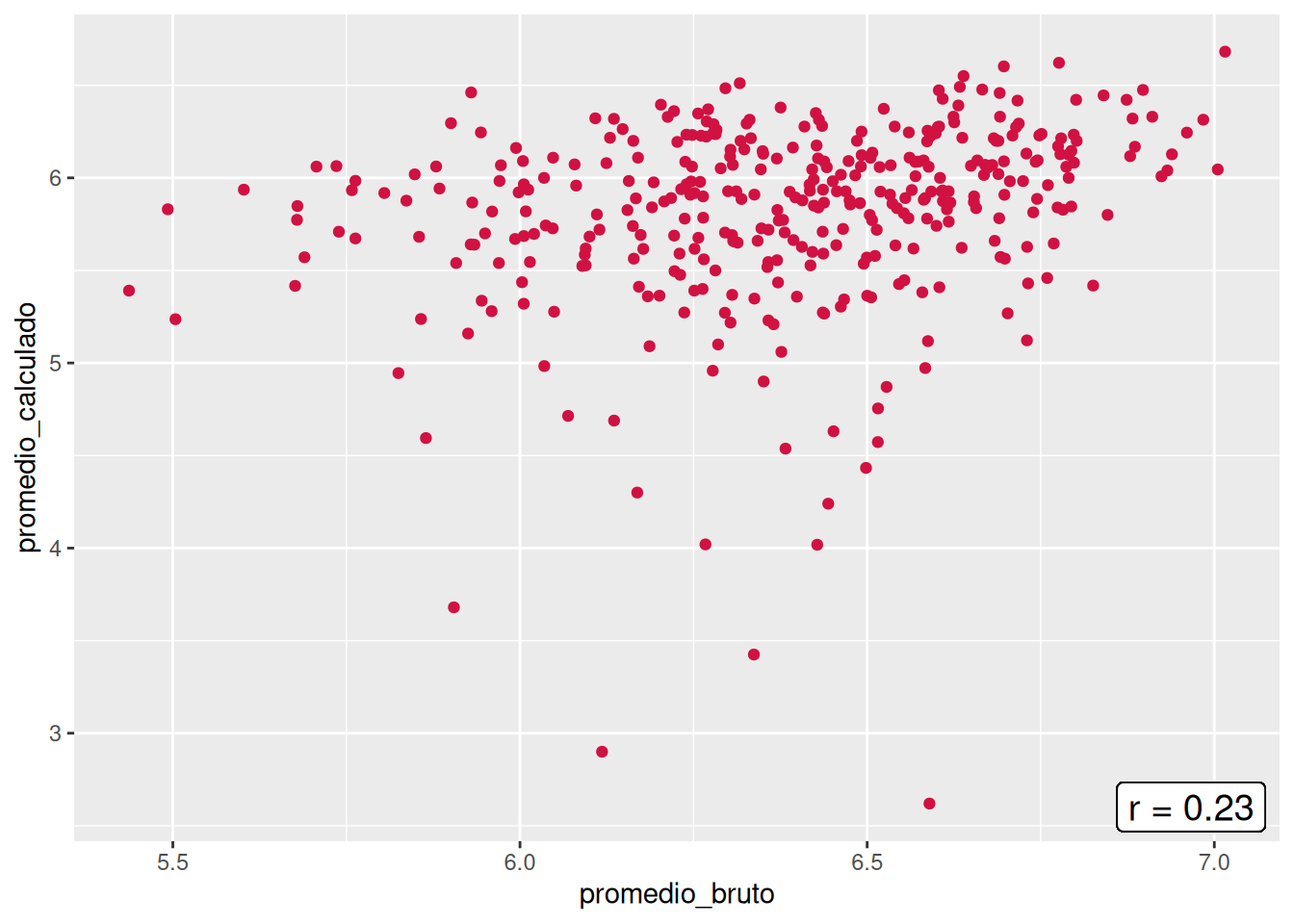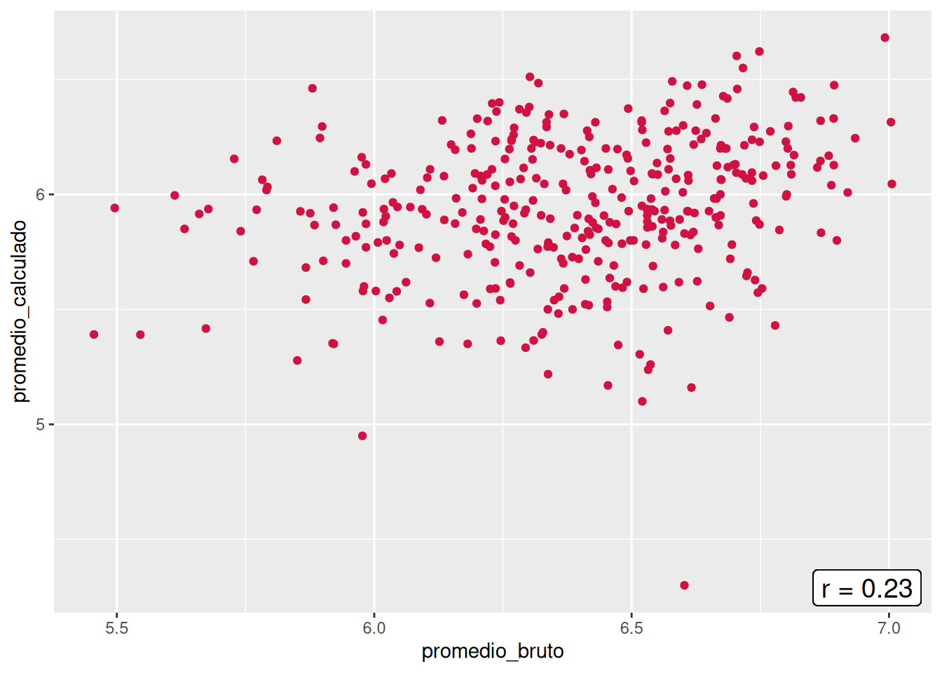 Al observar un valor tan bajo en la correlación de los promedios (\(r = 0.18\)), podemos plantear que hay un desajuste entre el promedio en bruto y el promedio calculado, lo cual se condice con la falta de un patrón claro en la nube de puntos. Sin embargo, el resultado no es significativo (\(p = 0.08\)). Para ahondar en este resultado, aplicaremos el mismo proceso pero a un set de datos de la carrera de sociología considerando todas las cohortes disponibles, con tal de ganar poder explicativo.