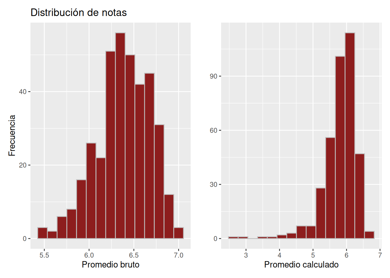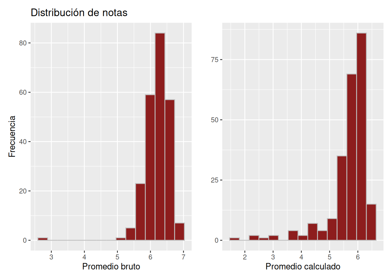 options(scipen = 999)Esta sección pretende documentar todas las decisiones tomadas durante el procesamiento de las bases de datos, desde su limpieza hasta la construcción de la base final. En principio, se trabajará con dos bases: la que viene con el promedio calculado a partir de los semestres cursados por el estudiante (1), y la base que contiene las notas desagregadas por curso (2). A partir de esto, se generará una base final que contenga las dos maneras de visualizar las notas, y posteriormente se realizará una comparación de los promedios (el por defecto y uno calculado a partir de las notas de curso) para comprobar si son equivalentes 1. Por último, se presentarán algunos resultados descriptivos orientados a encontrar diferencias en los promedios de las distintas carreras.