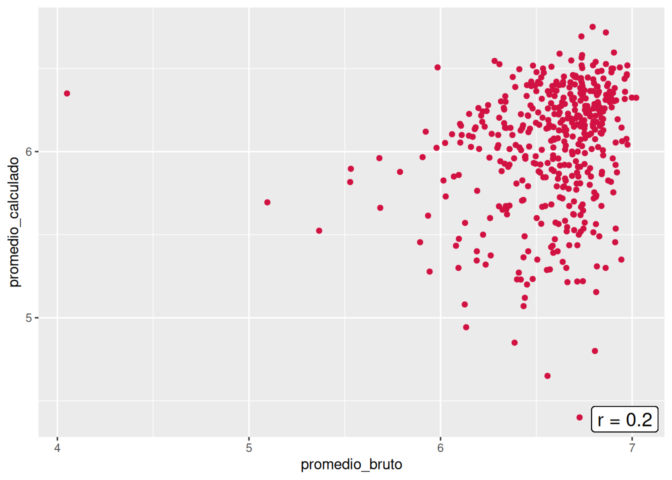 Se puede apreciar que, al menos en los primeros diez casos, existen diferencias entre el promedio integrado en la base de datos y el promedio que calculamos nosotros. A pesar de ello, este resultado no entrega información concluyente, por lo que ahondaremos en esto calculando la correlación entre ambos promedios. Mientras más alta la correlación, los promedios deberían estar más cercano el uno al otro.